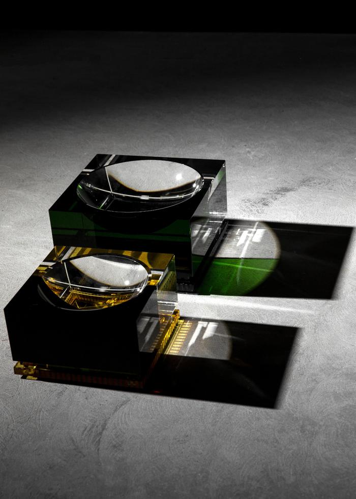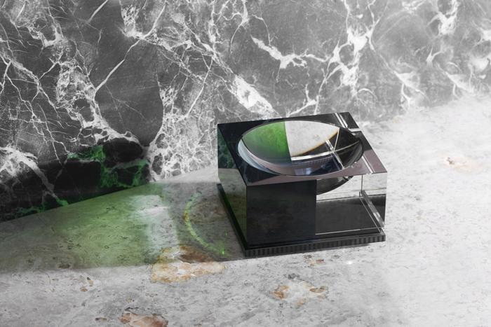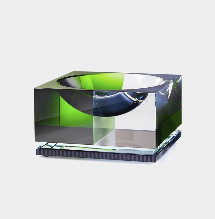 Reflections Copenhagen's Denver bowl large encompasses Julie Hugau and Andrea Larsson's fascination with light and reflection, which can be seen when the green, clear and black hues are illuminated. It's crafted from fine hand cut crystal and shaped into a thick cube that has a dipped, curved centre and rests on a ridged base. Place it on a coffee table for an Art Deco-inspired focal point.
