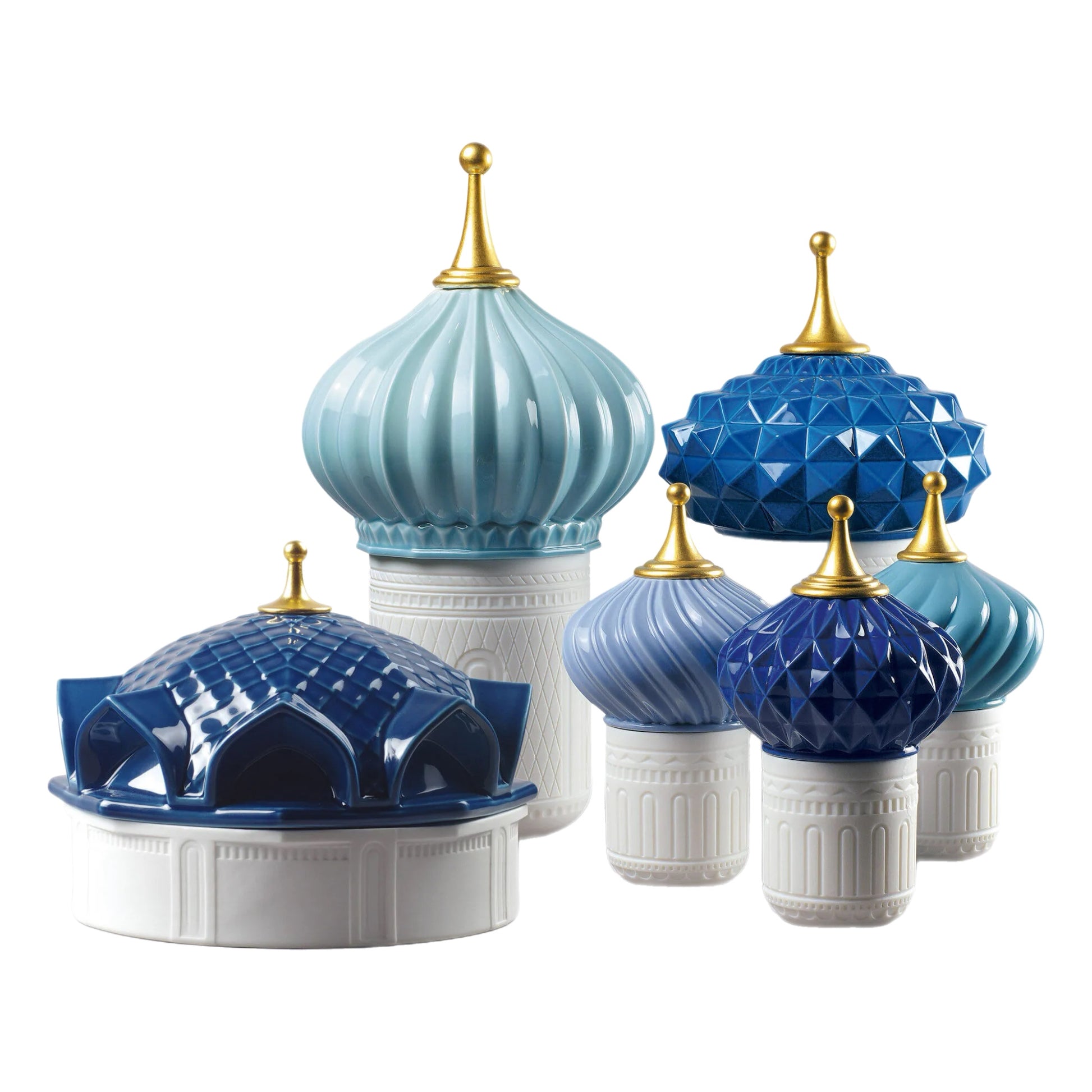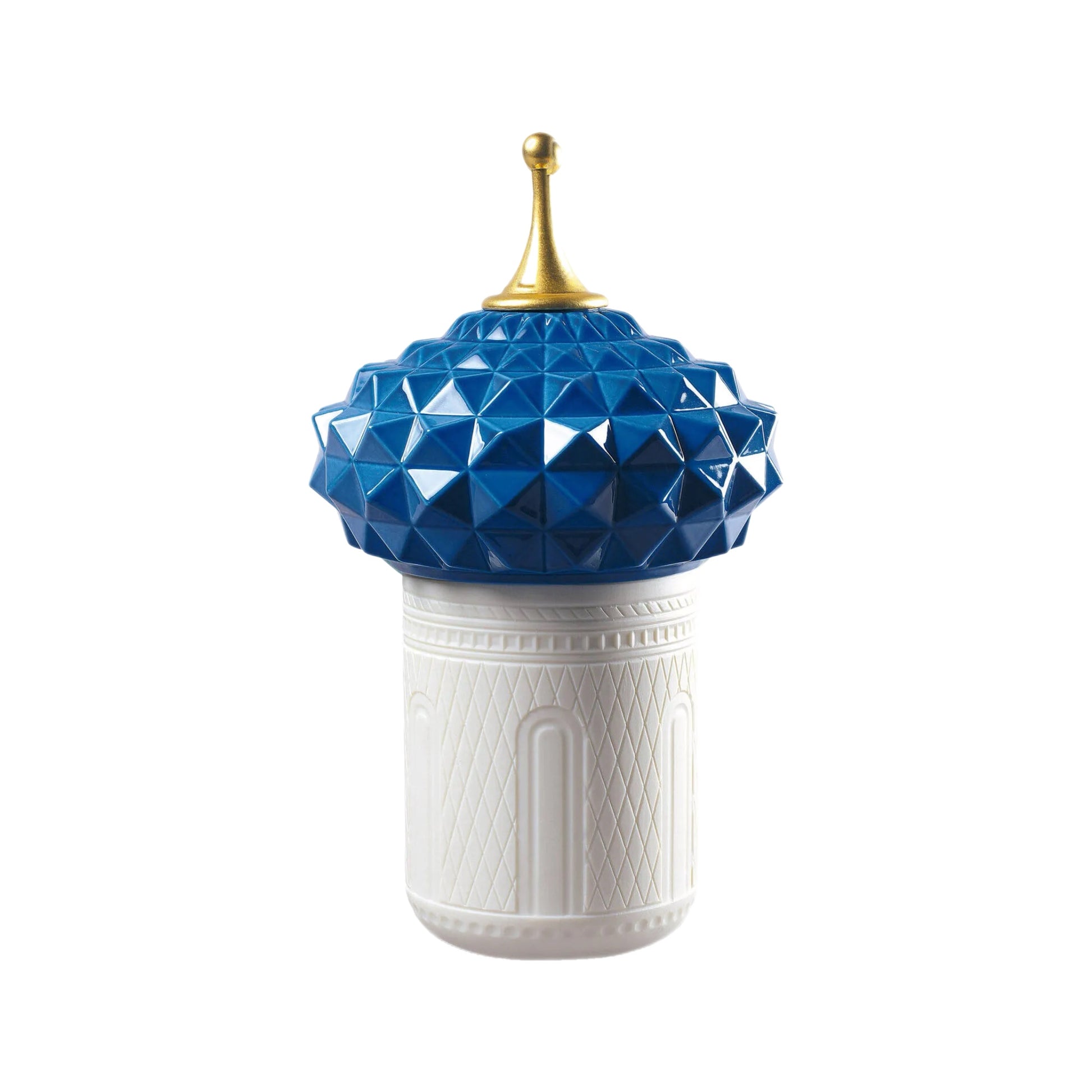 "Inspired by the magical world of the tales of the Arabian Nights and its evocation of exoticism, fantasy and adventure. The candles in this collection delicately combine light and aroma to produce a dreamy atmosphere. Held in poetic containers of translucent porcelain, the luminous effect produced by the hand-engraved motifs on the surface transports us to a world of fairytales. The elaborate dome protecting the wax is embellished, hand painted and crowned by a point decorated with 22 carat gold lustre, applied by means of a complex artisanal technique. It is comprised of natural wax and 15% perfume, which is a particularly high percentage for candles of this category and equivalent to ´l'eau de parfum´ in the world of perfume. It is available in the fragrance ´Indomitable Spirit´, an exotic aroma of bergamot, cardamom and musk created exclusively for Lladró. Content: 285 g/10.5 oz. Duration: 65 hours. Smoke-free wick."