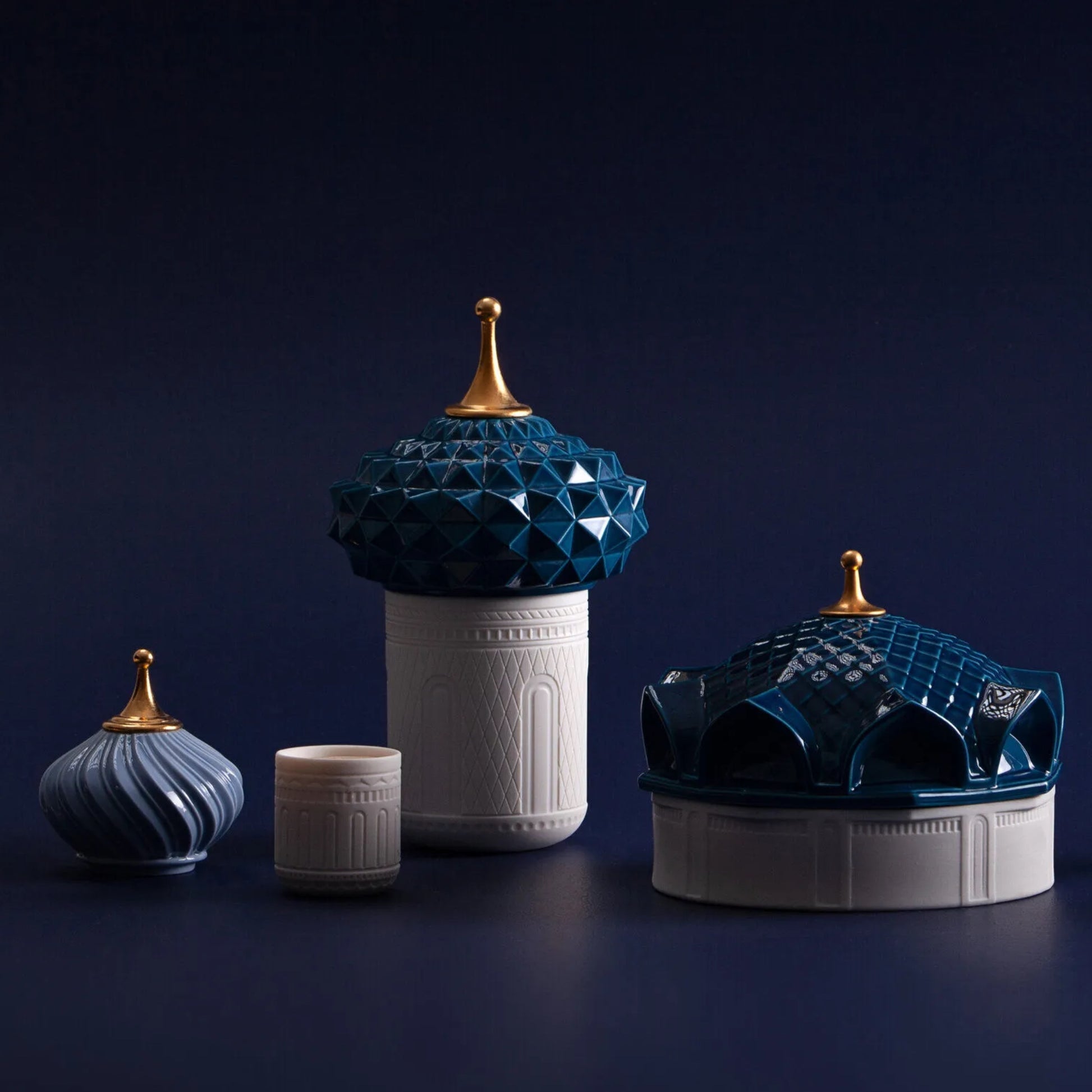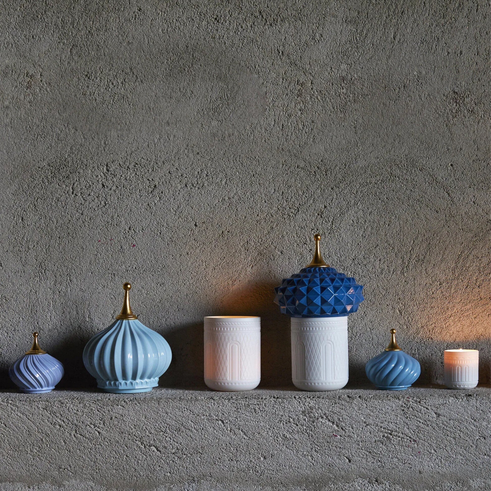 Candle for the home, designed in the shape of a tower, with a translucent porcelain container and blue and gold lustre cover. Its scent carries such special ingredients such as cassis, lotus flower and frankincense.