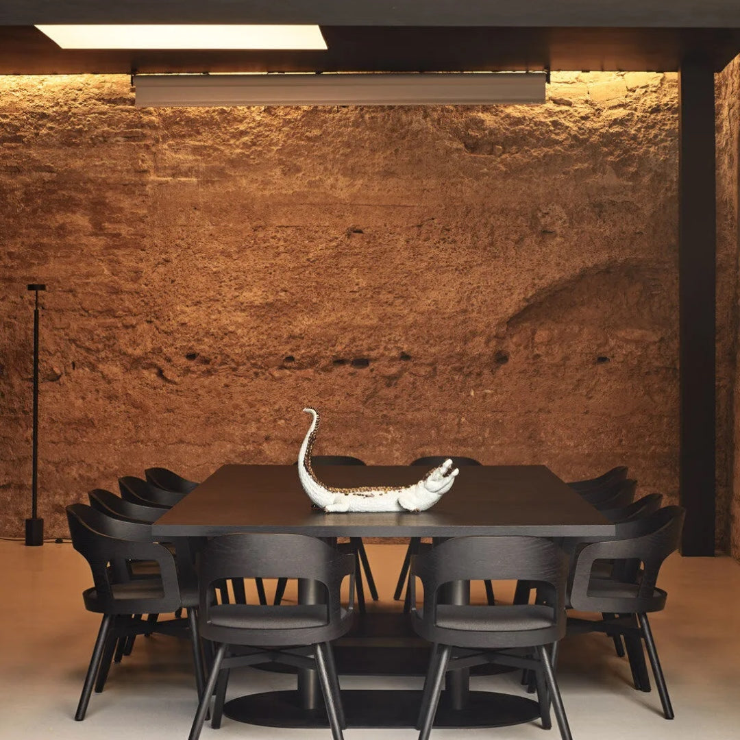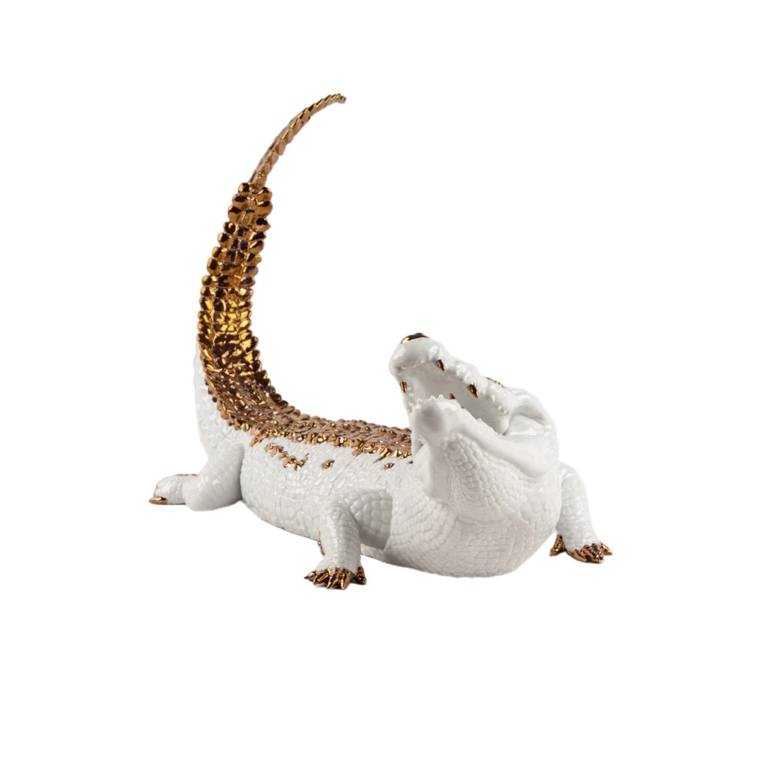 The crocodile, from the Greek kroko –deilos meaning stone man, has been worshipped since ancient times by different civilizations and cultures. Inhabitants of our planet for over 50 million years, these prehistoric predators represent a profound long-lasting connection with Mother Nature. Their ability to live on land and in water, their sharp vision and hearing, and their energy, means that they are symbols of protection and also of equilibrium and analysis. This magnificent example in white glazed porcelain is decorated with copper luster and measures over fifty centimeters long. A truly impressive work sure to capture all eyes.