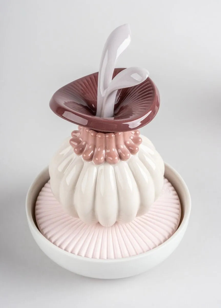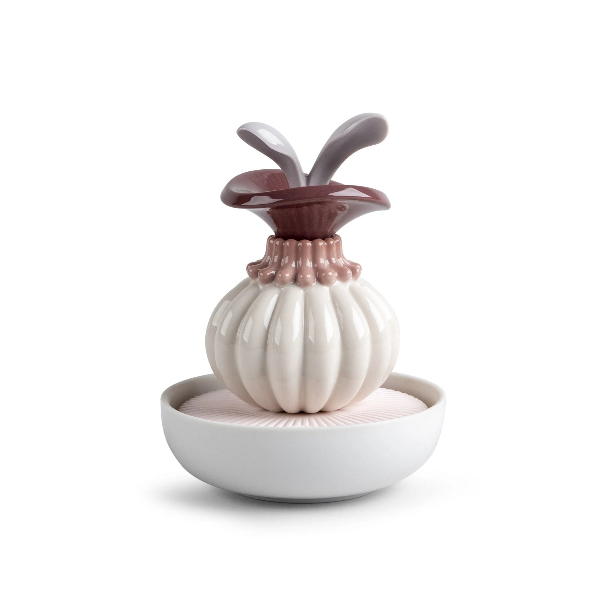 El mundo vegetal es una fuente inagotable de inspiración para los artistas de Lladró. De sus innumerables formas orgánicas y sus infinitos matices de color surgen los diseños de estas flores imaginarias que funciona como difusor de los aromas más exquisitos. La flor del difusor está elaborada con porcelana brillo mientras que para las bases se emplea una porcelana mate porosa. Una formulación especial que permite que el aroma del perfume vertido en la base se difunda al ambiente de manera natural. Este difusor se compaña de la esencia Jardines de Valencia. Un aroma fresco de bergamota, tuberosa, sándalo y almizcle que nos transporta a noches de verano a la luz de la luna.