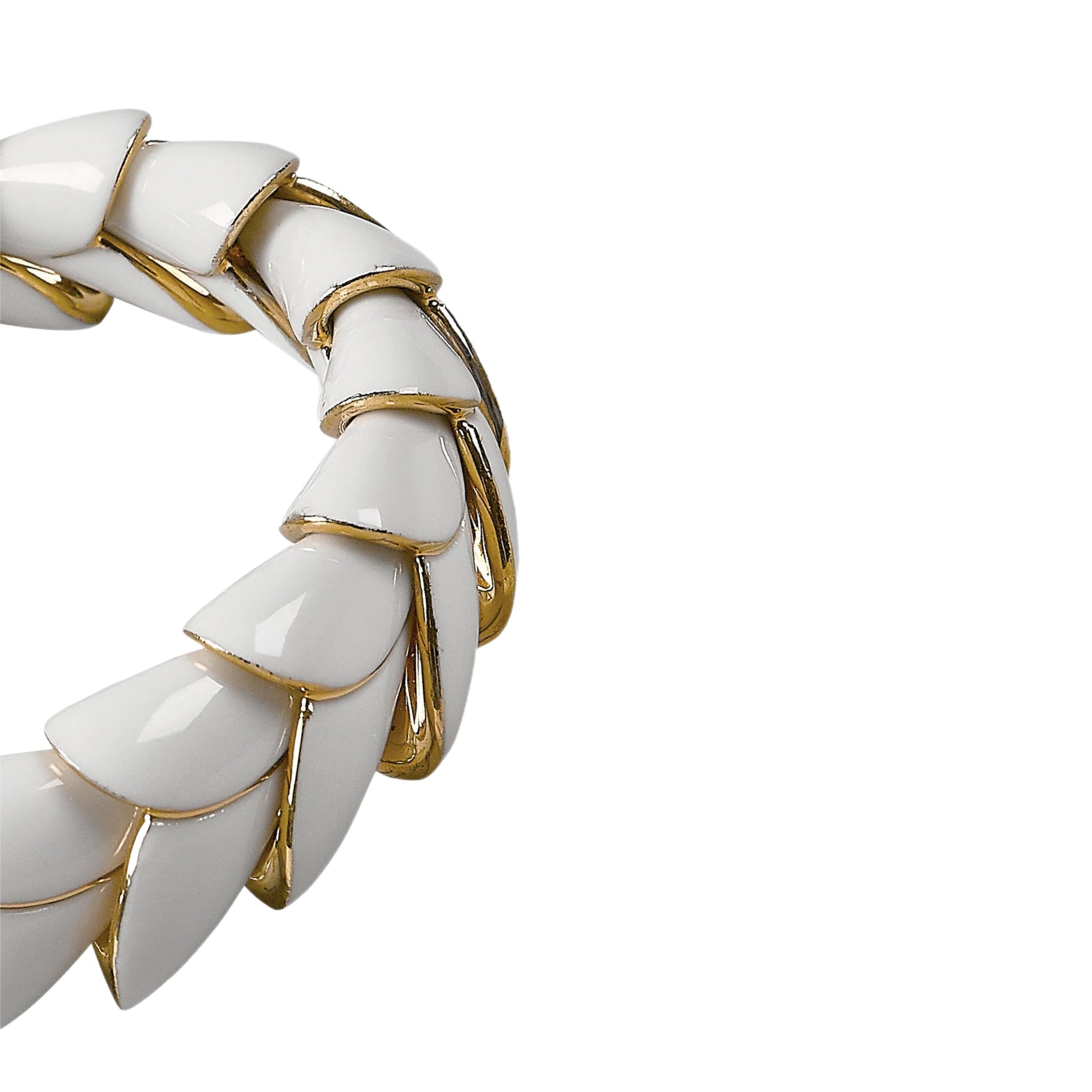 Bracelet inspired by the delicacy of the Heliconia flower, composed of 17 hand-painted porcelain petals, gloss finished with gold lustre. An elastic rubber crosses the petals inside for easy adaptation and use.