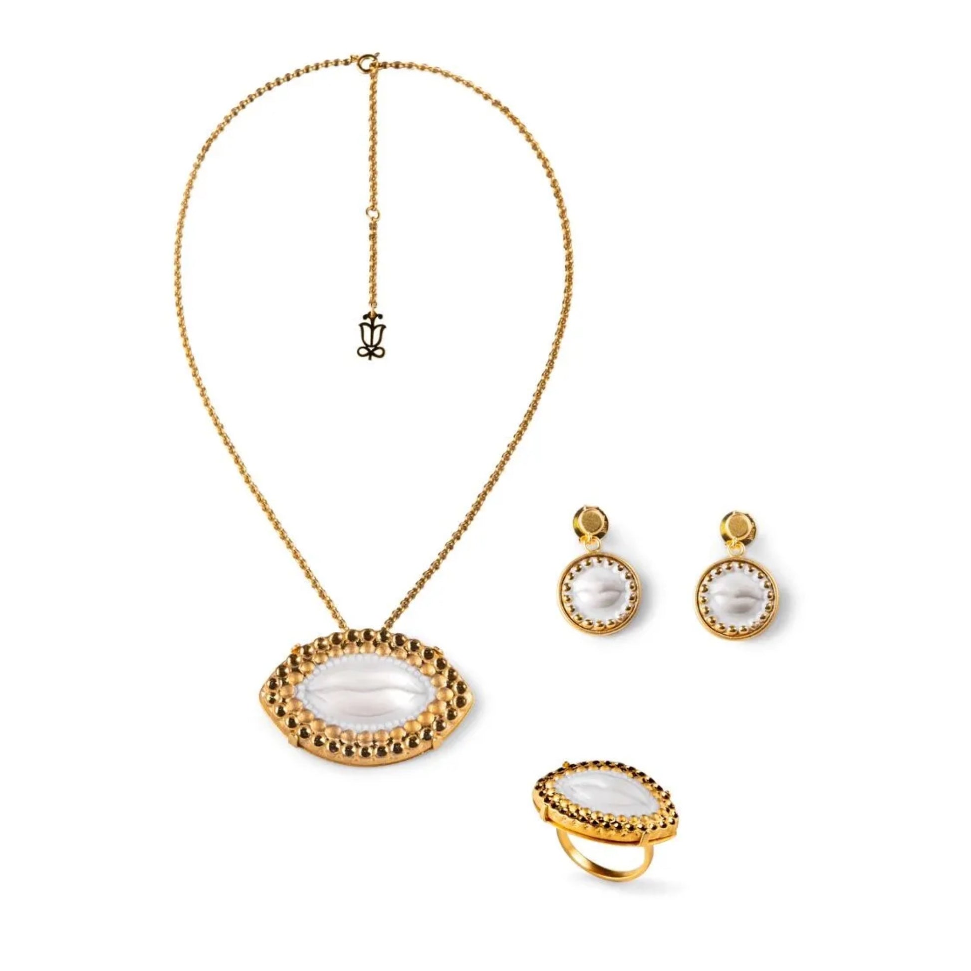 Affectionate, passionate, unforgettable. Kisses reinforce the meaning of words and very often express a multitude of feelings without the need for any words at all. They can be gestures of joy, love, tenderness or passion. Life without kisses would be all the poorer and, as many scientific studies contend, also less healthy. Perfectly outlined lips are the focus of these earrings. They are made on white porcelain surrounded by a frame of tiny balls decorated with matte and glazed golden luster. The metal parts are 18-karat gold-plated 925 sterling silver.