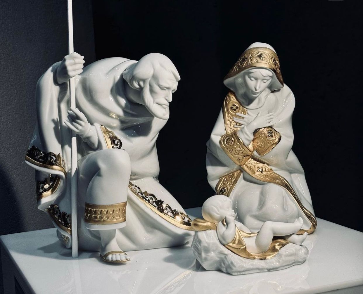 Porcelain glossy figurines of Virgin Mary, Baby Jesus, St. Joseph in glossy and matte white and golden luster.