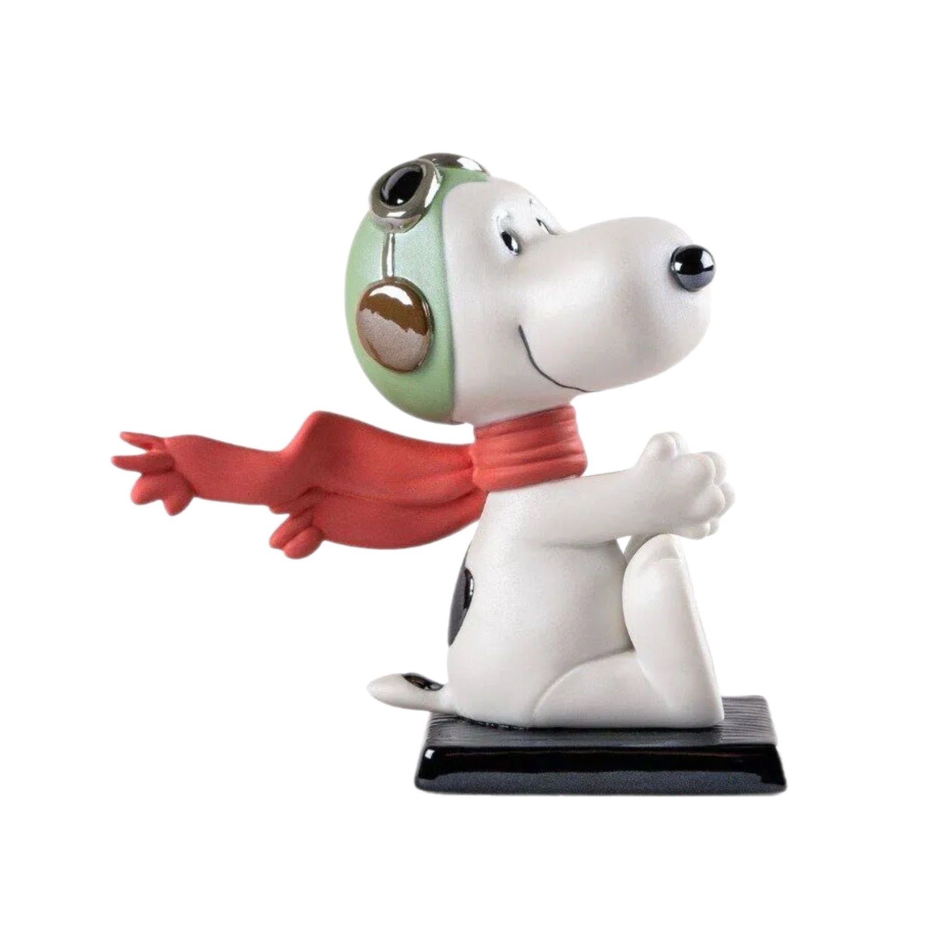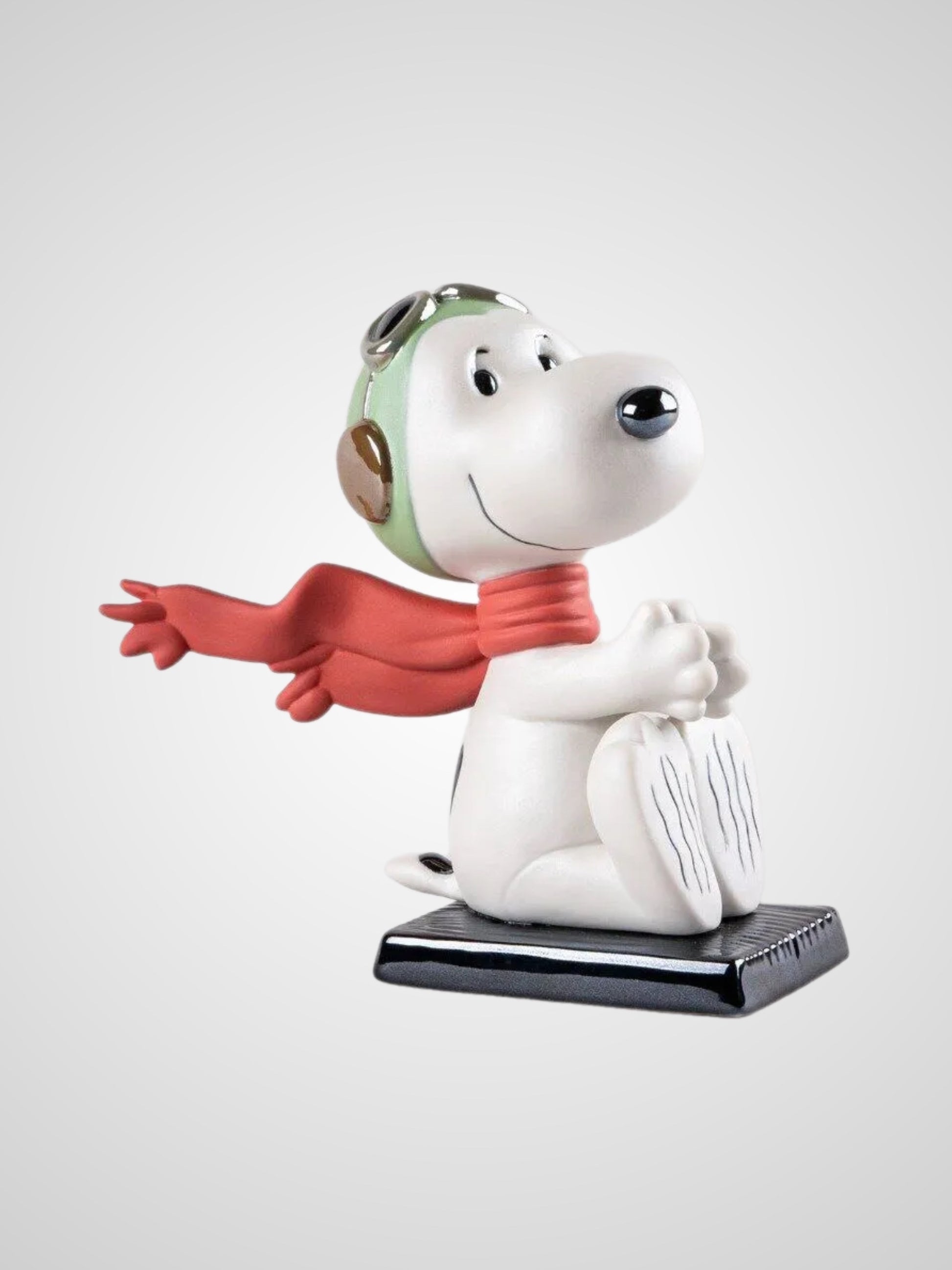 Snoopy and Charlie Brown are famous characters created by Charles Schulz for the Peanuts comic strip and Lladró artists have now recreated them again in porcelain. Snoopy Flying Ace faithfully reproduces Snoopy in one of his fantasies as a daring pilot. It is made in satin white porcelain with a carefully chosen decoration featuring silver luster and red for his scarf.