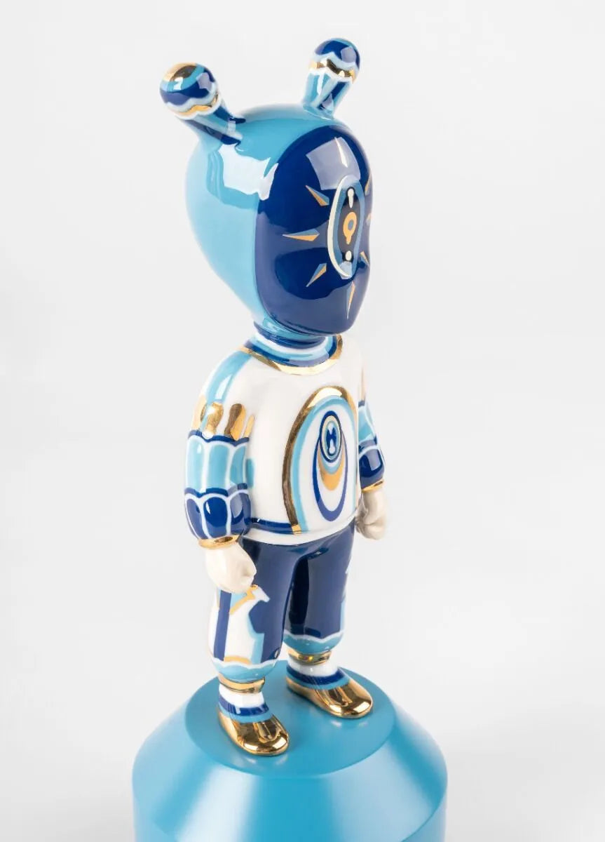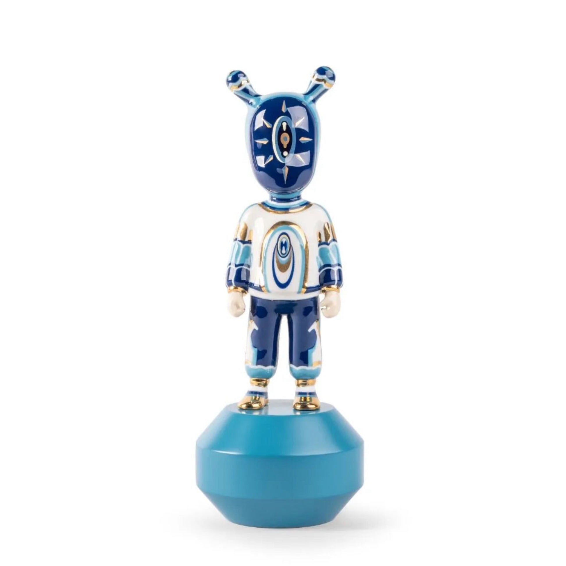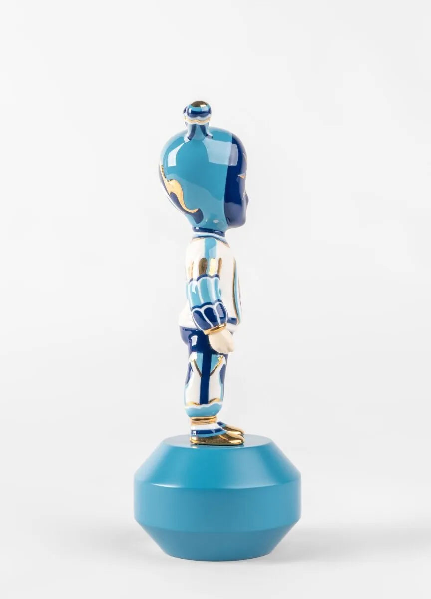 This version of The Guest is by Kzeng Jiang, the first Chinese artist to join the creative universe of this iconic character. The work of the Shanghai-based designer reflects the contemporary culture of Asia in in vibrant, radical illustrations. Kzeng seeks to render his cultural roots through symbols of traditions like Chinese facial painting or flower painting from the Song dynasty, reinterpreting these elements in his own personal style. In this case, for instance, he is portrayed with three big eyes on his face which, according to Kzeng, “allow him to see the past, present and future as if he were a messenger travelling through time.” As regards color, Kzeng chose blue tones on the white porcelain to ensure a sense of visual harmony and balance. He then combines these colors with touches of golden luster in order to convey the sensation of prestige associated so closely with ancient Chinese porcelain. The end result is a creation that captures the elegance of porcelain in a conceptual and contemporary design.