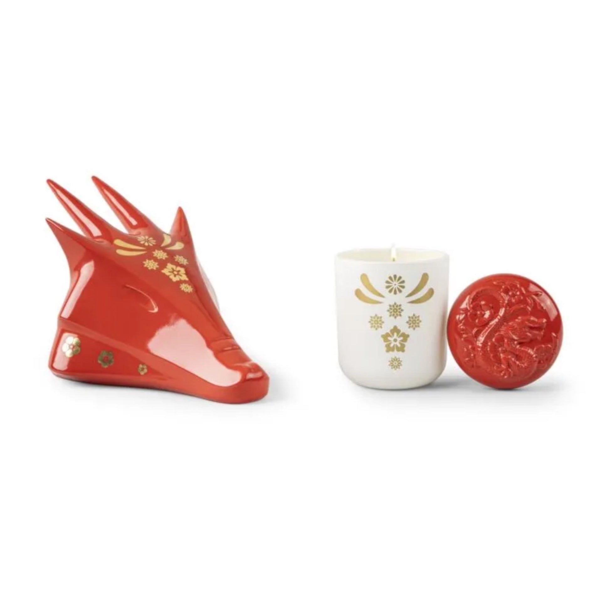 We are celebrating the Chinese New Year / Lunar New Year with an exclusive pack containing two creations — the Dragon sculpture and a scented candle with a dragon on the lid, both with a unique decoration with golden motifs — and six New Year envelopes. The animal ruling over 2024, the dragon symbolizes power, energy, honor and good fortune. According to tradition, the Year of the Dragon is believed to be a year of transformation, growth and abundance. Our artists have reproduced this zodiac sign in a sculptural creation that combines conceptual design with traditional colors like red and gold. The dragon’s head and the recipient for the candle are specifically decorated for this pack with an exclusive golden motif. A decorative piece with a home fragrance with the Gardens of Valencia scent. A special set created in a limited edition of 288 units.