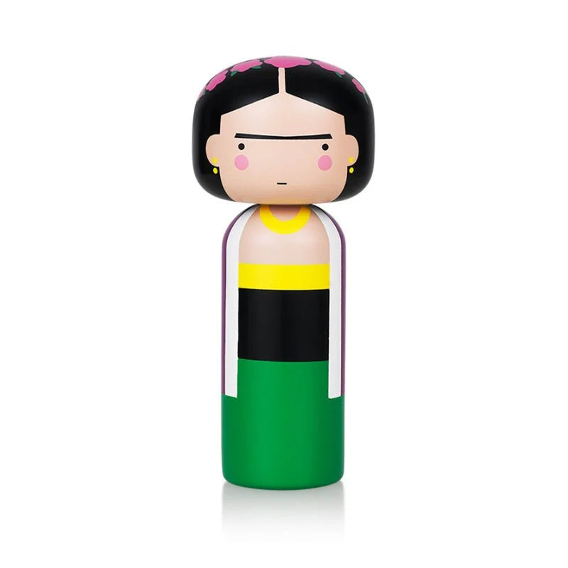 The Frida Kokeshi doll pays homage to the iconic Mexican artist.The Kokeshi features a striking design with a bold floral headdress, iconic unibrow, and a colorful dress inspired by the artist's self-portraits. The doll's design is a beautiful and playful representation of Frida's unique style and artistic vision.